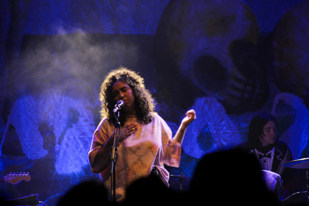 The stage at the Royale was dressed up on Sunday night in anticipation of Indigo De Souza’s arrival. The art from her latest album, Precipice, was displayed on a banner behind the instruments, and the room, coated in purple light, hummed with conversation, ready for the moment the room went black, and the stage was no longer unoccupied.