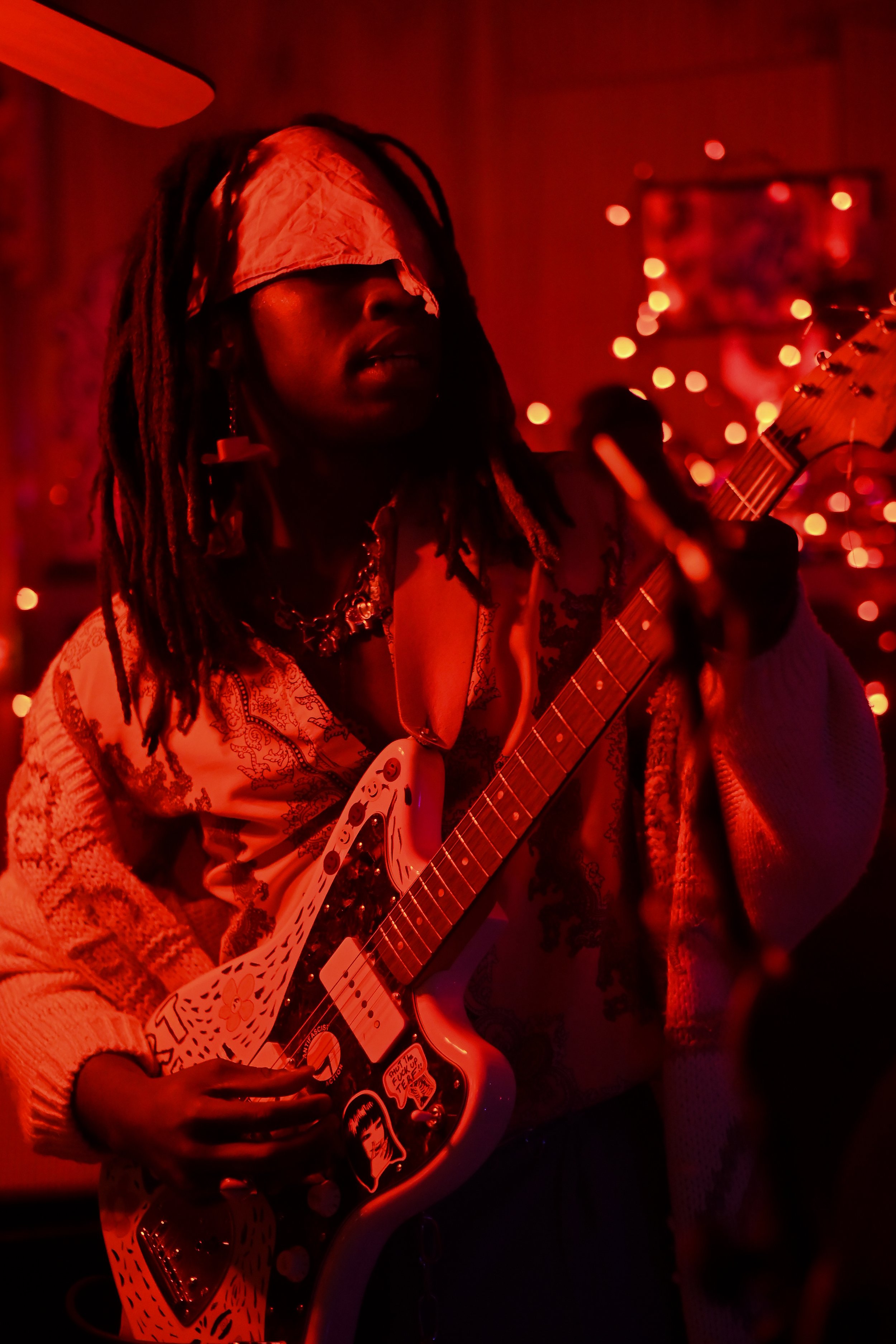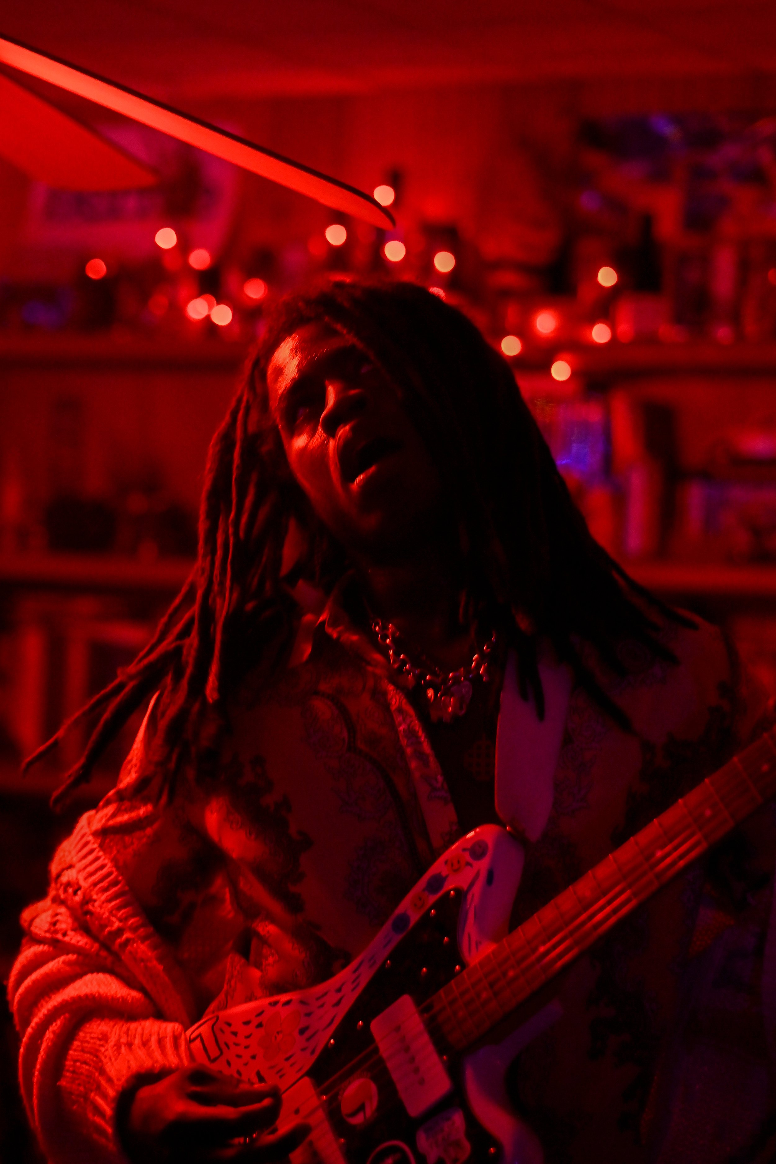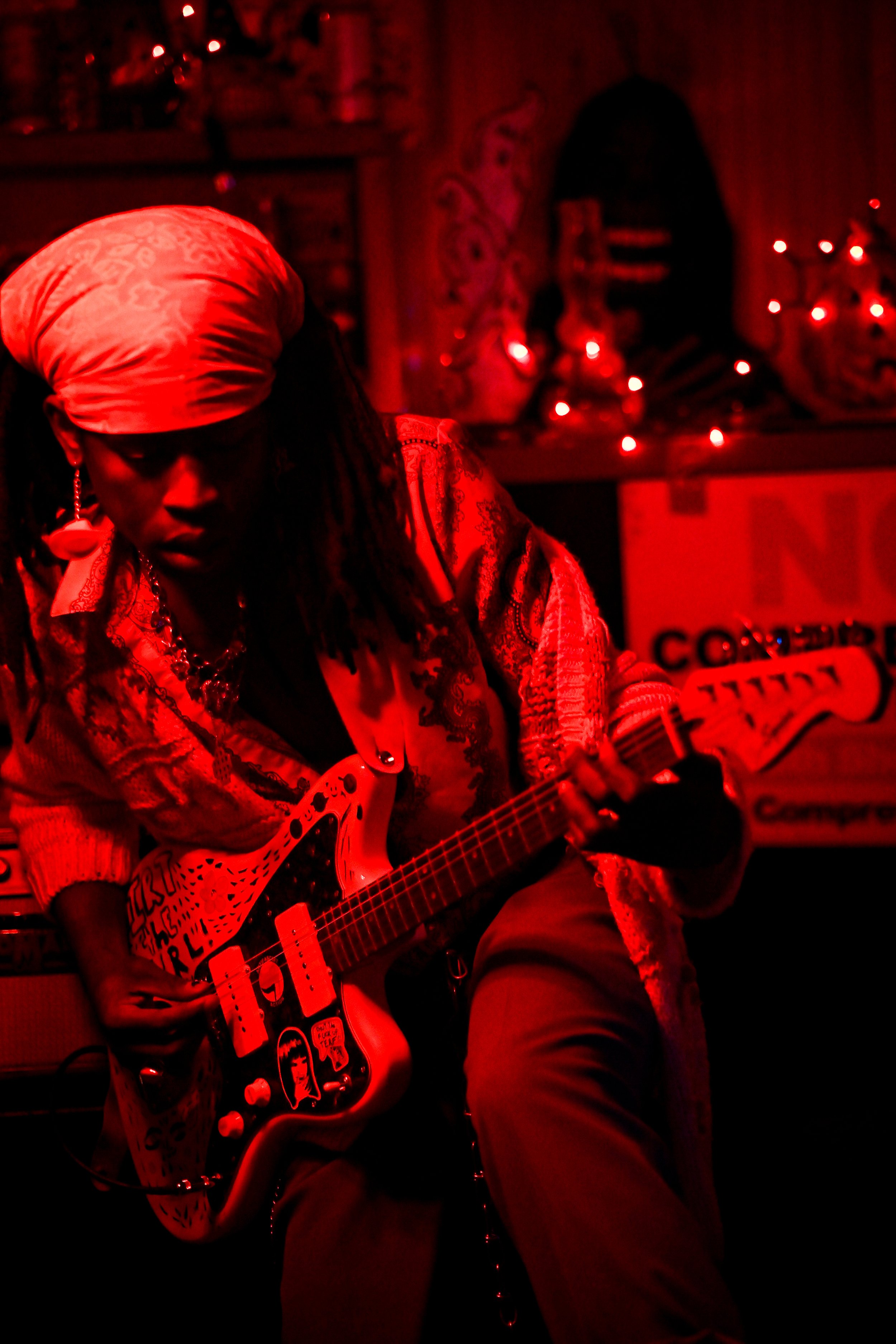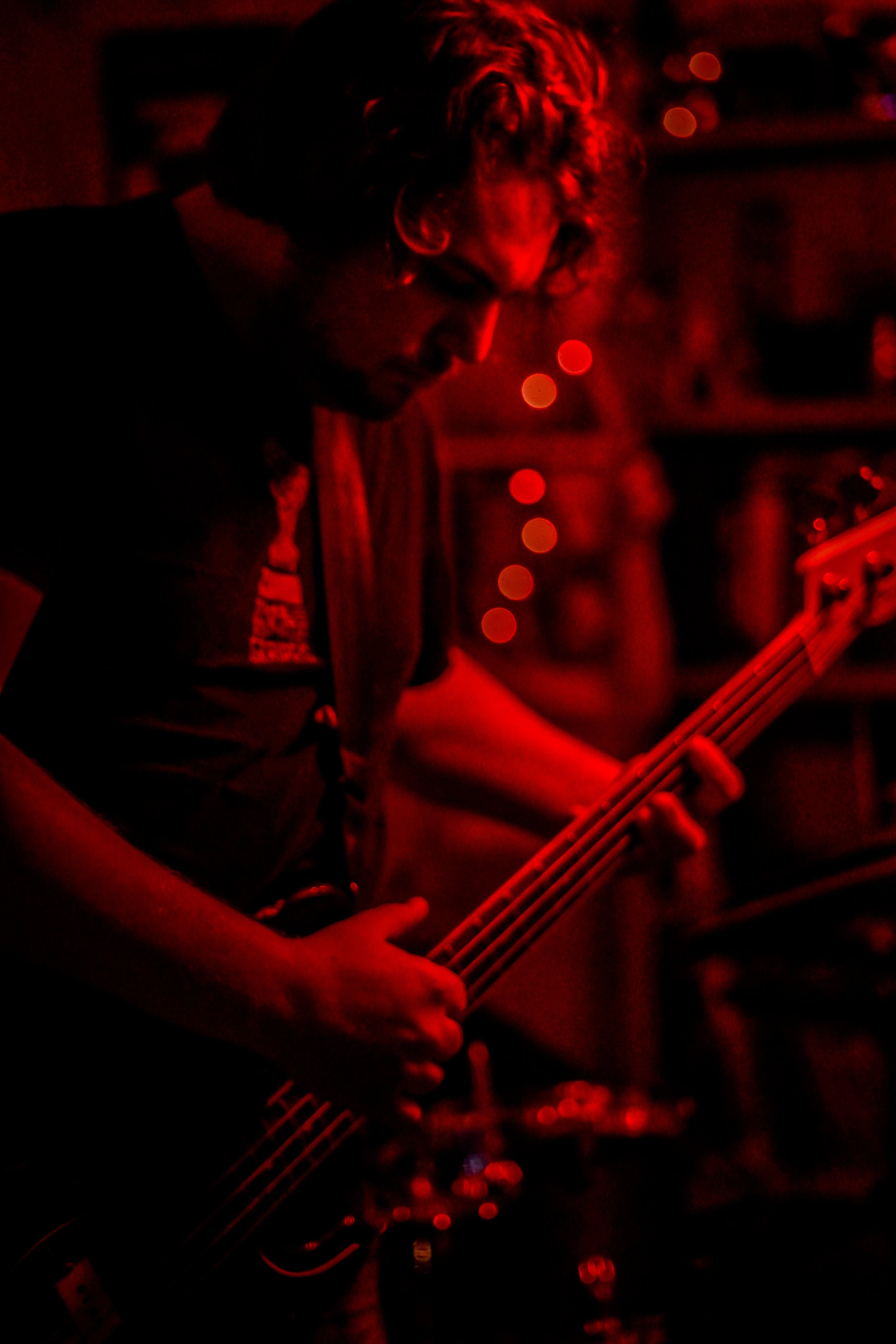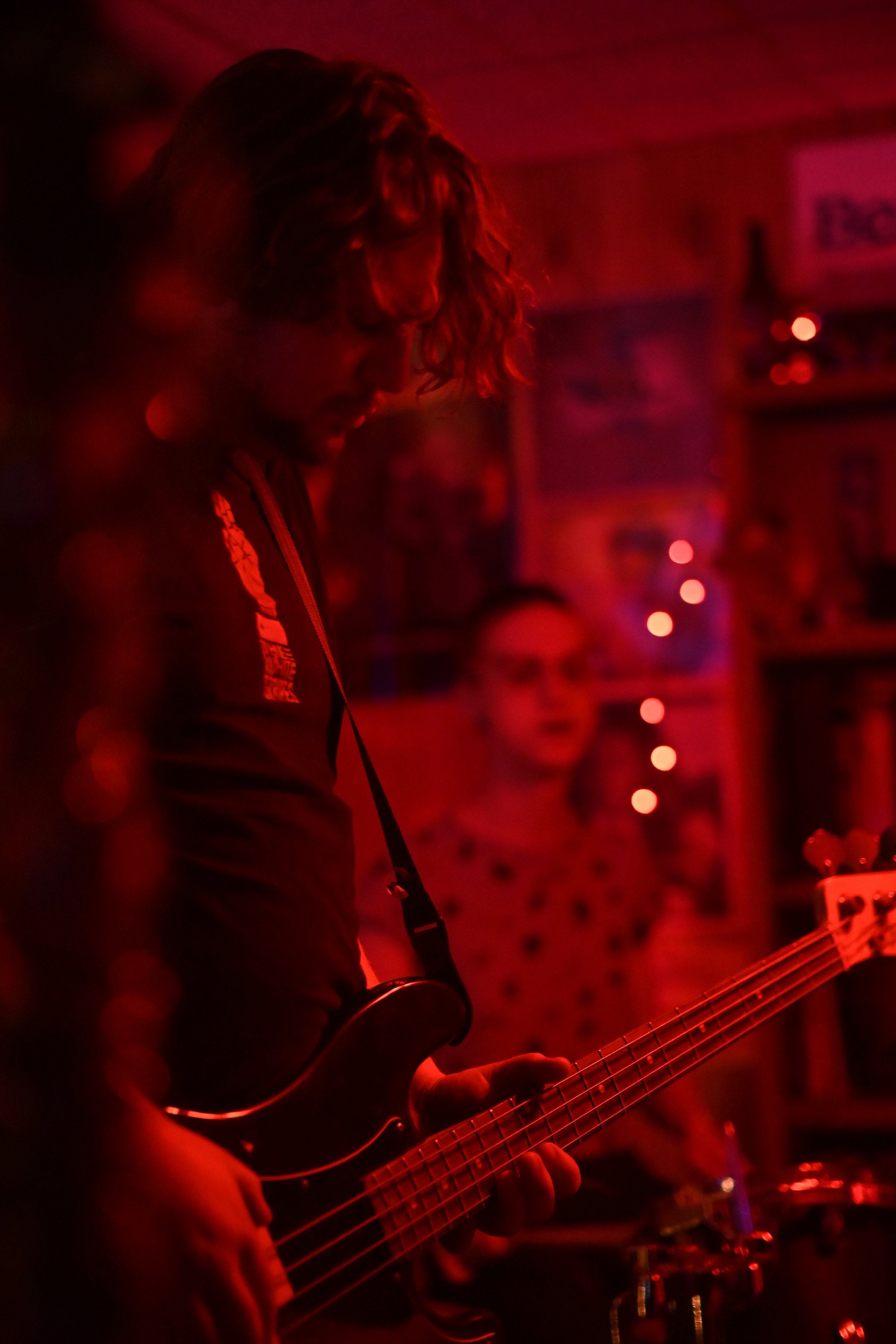 Finally, Rusty Mullet took the stage. I’ve been following them online for awhile and was beyond excited to see frontwoman Dirt’s (she/her) insane guitar playing up close in the cozy confines of the Dungeon. Equipped with pink cowboy hat earrings and a bandana she quickly shed in favor of headbanging, Dirt exuded an effortless coolness that gave way to chaotic frenzy once she started playing. After starting with some psychedelic riffs ripped right out of the 60’s, Dirt leaned over to the mic to say “Everyone else was being super jammy so we figured we’d do it too,” before launching into the next song. That in-the-moment drive was shown throughout the set, as Dirt, bassist John Frechette (he/him) and drummer Sunny (she/her) decided what directions to go as members of the crowd called for more, electrified by the energy on stage. Dirt, swinging her hair as she played with such energy that the fan on the ceiling was spinning with her, is balanced in her helter-skelter style perfectly by the relaxed calm of John on bass, who casually sat down on an amp while playing during one of the final songs. I can’t wait to see Rusty Mullet again.