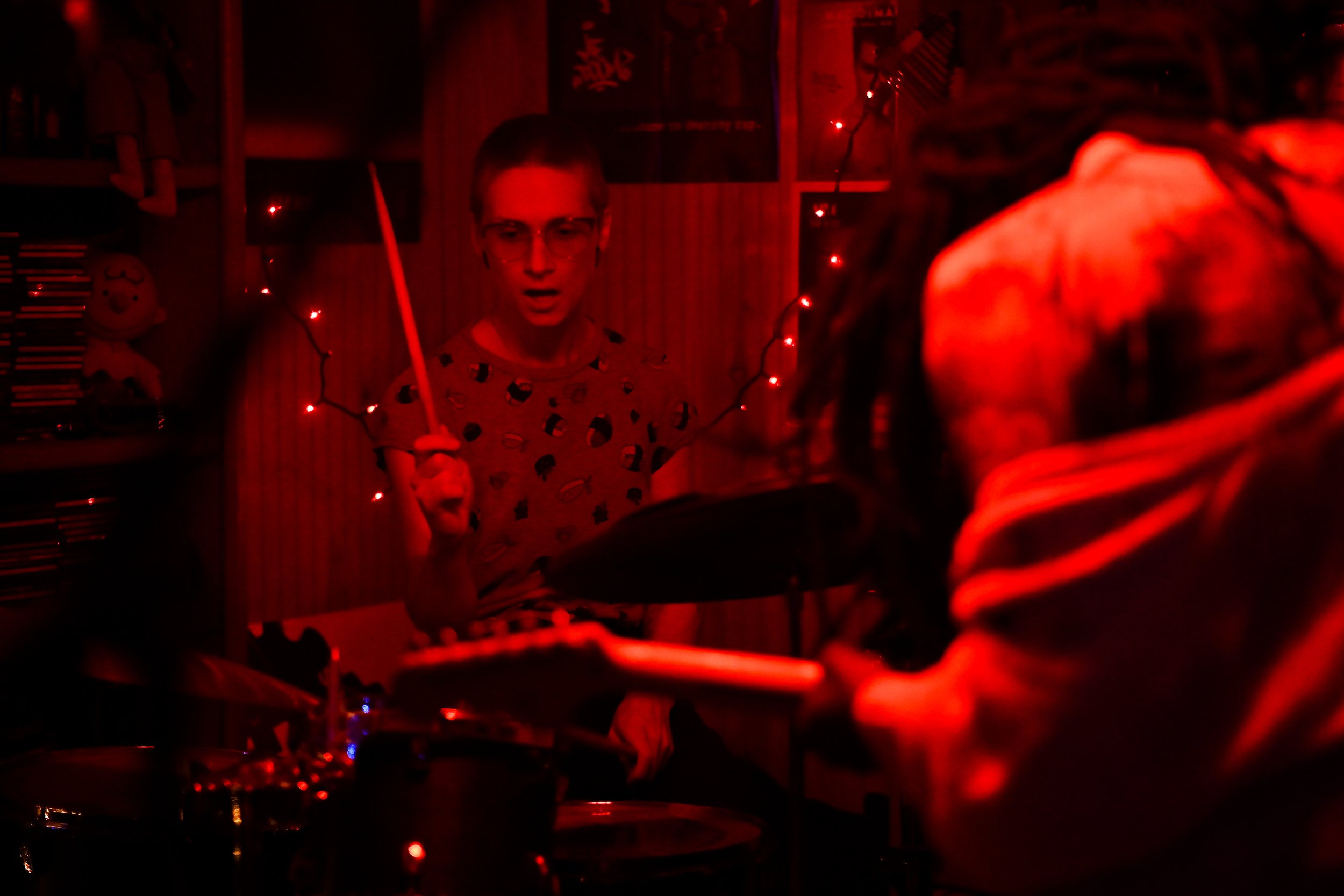 As sleet turned to snow on the evening of Fri., March 12, Will and I made the journey to Weymouth, Massachusetts to see Free Rock Trio and Rusty Mullet at Dud’s Dungeon. John Quinlan (he/him), one of the organizers of the DIY space, remarked that the weather always sucks whenever they throw a show. Everyone who entered the warm, wood-paneled room was greeted like an old friend; most of them were. Quinlan let us know this was the first show they’d put on that was open to the public since COVID first started. Since then, they’d mostly been playing live music for their friends.